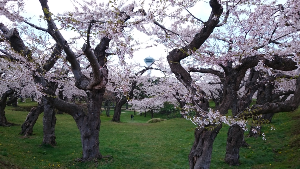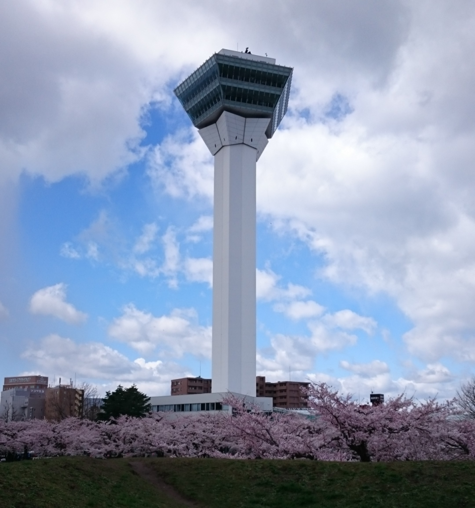 五稜郭タワーを背景に桜を眺める