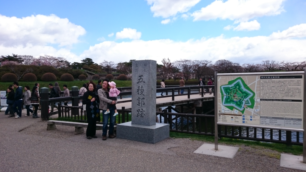 五稜郭の入口には、石碑が立っていて、観光客が記念撮影をしている姿が見られました。