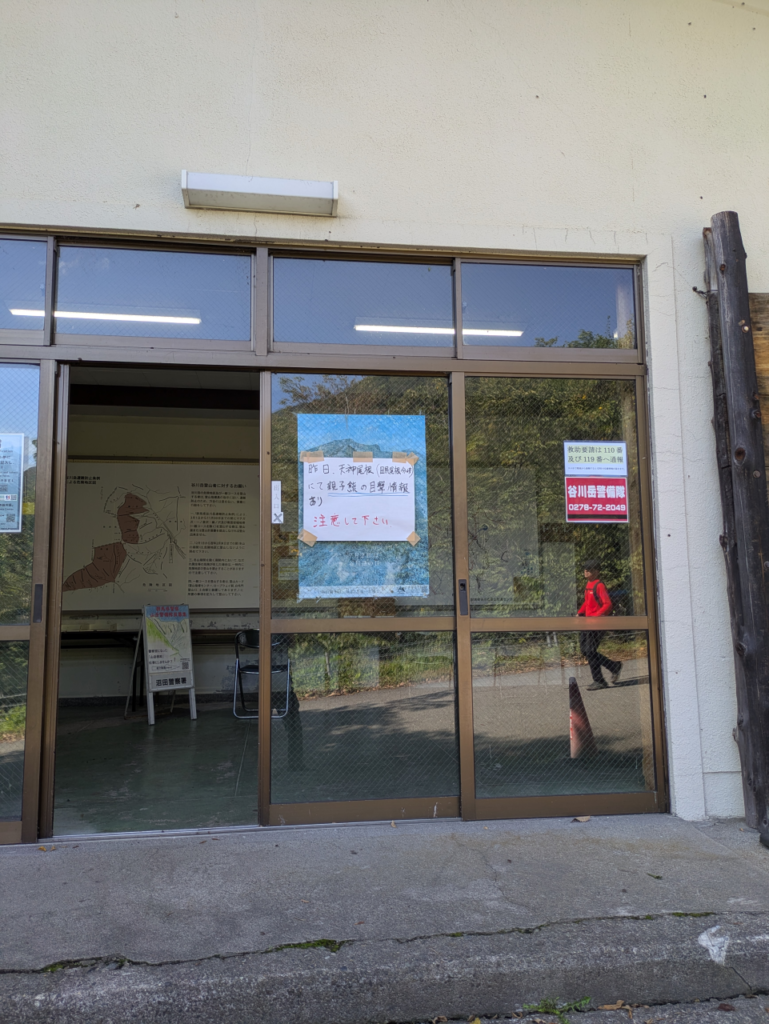 しばらく進むと「谷川岳登山指導センター」が見えてくる。建物の前には「昨日、天神尾根にて親子熊の目撃情報あり。注意してください。」という張り紙が貼られていた。この写真はその張り紙。