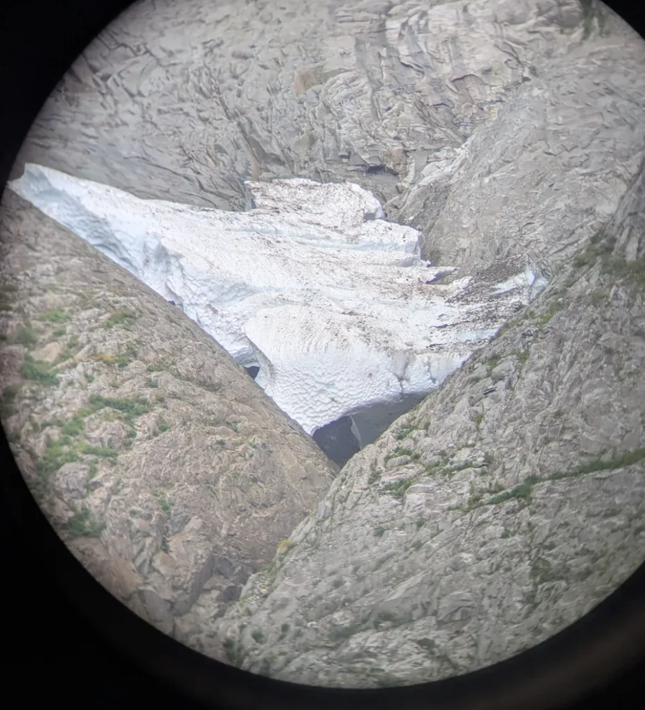 無料の望遠鏡が設置されていたので、覗いてみることに。スマホのカメラをレンズに合わせてみたら、意外と綺麗に撮影できた。この写真はその万年雪のアップ。望遠鏡越しの風景が、手元に残るのは嬉しい発見だった。