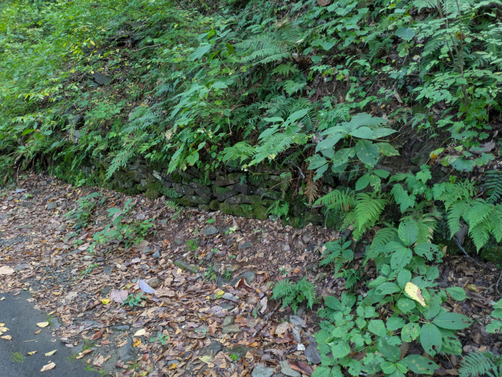 途中、石垣が現れる。この写真はその石垣。解説看板には「明治時代の石垣がところどころに見られる」と書かれていた。苔むした石の並びに、時代の重みを感じる。