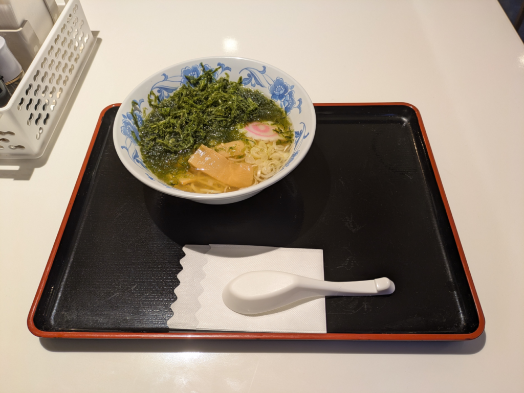 途中、船内レストランへ移動。私は「島海苔塩ラーメン」を注文。窓の外は真っ暗で何も見えないが、船で移動しながらラーメンをすするという体験は、非日常感があって妙に楽しい。