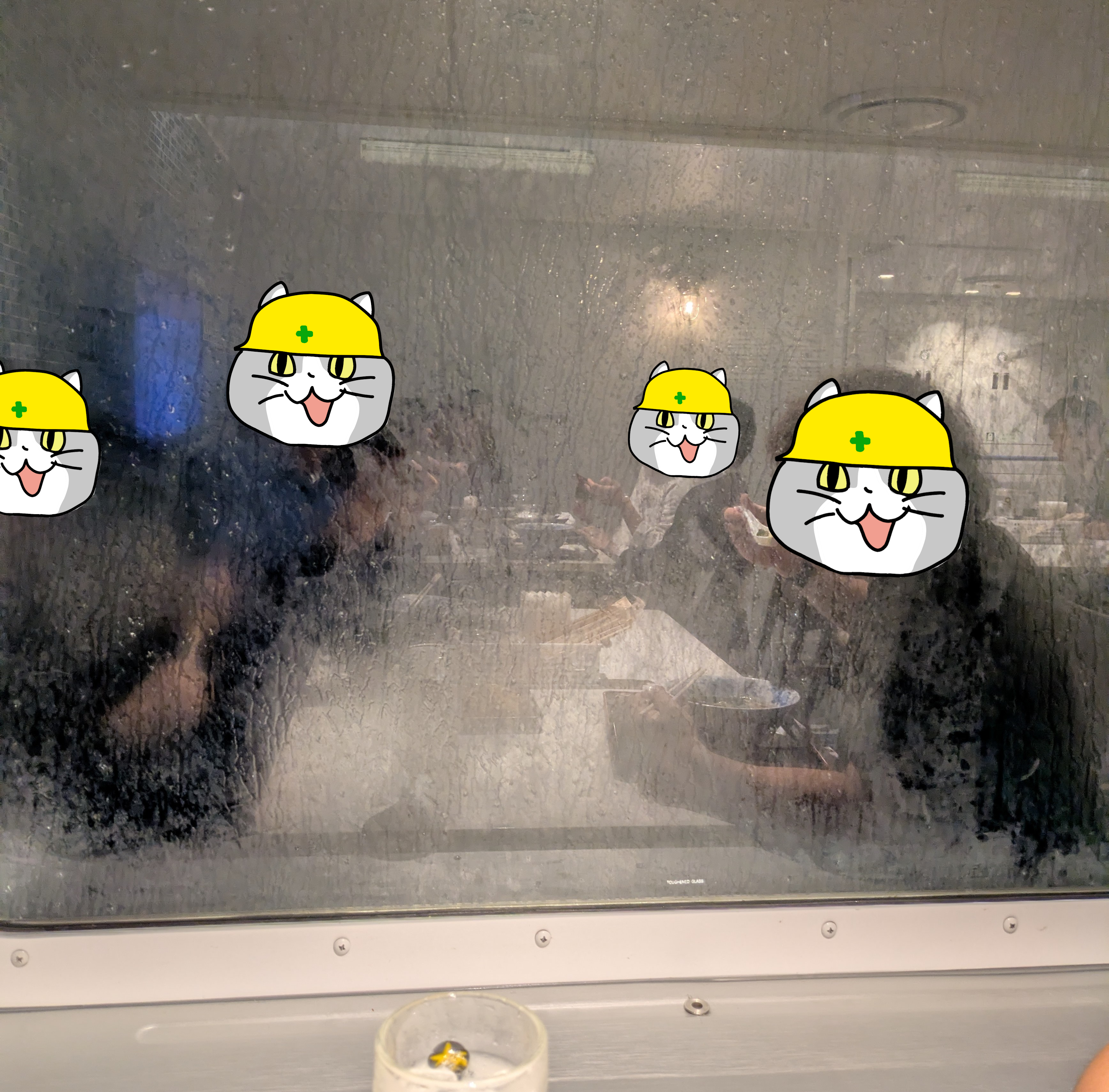 船内食堂の窓の眺めを撮ろうと思ったが、外は真っ暗闇と窓に付いた雨粒。我々が映り込む。(筆者撮影)