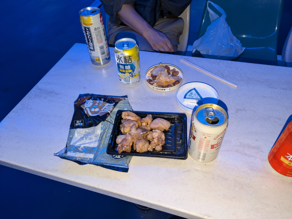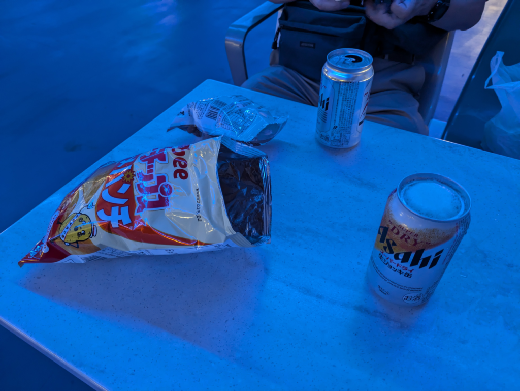 出航前、竹芝客船ターミナルの待合室で、売店を物色。お酒とつまみを調達して、旅のテンションをじわじわと高めていきます。