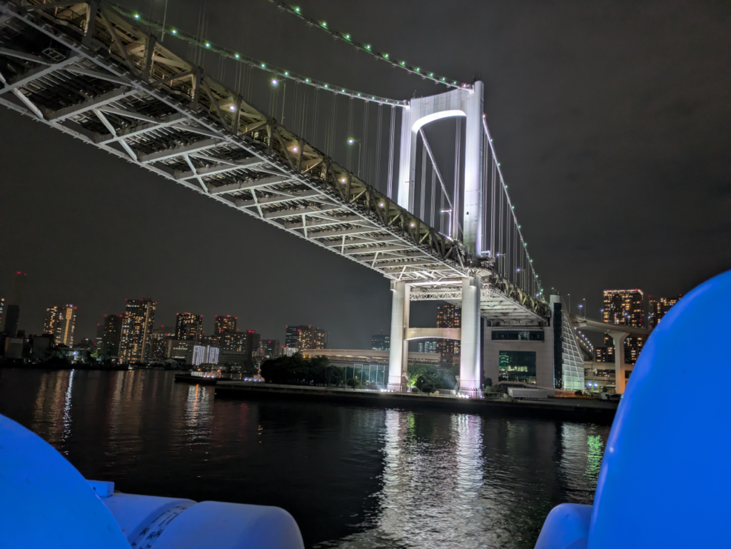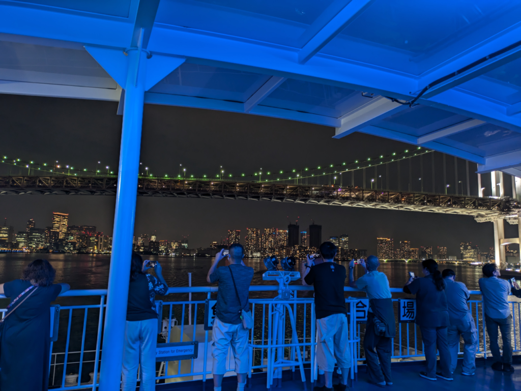 出航してしばらくすると、レインボーブリッジの真下をくぐる瞬間が訪れます。デッキにはカメラを構える人たちが集まり、東京の夜景に見入っていました。
