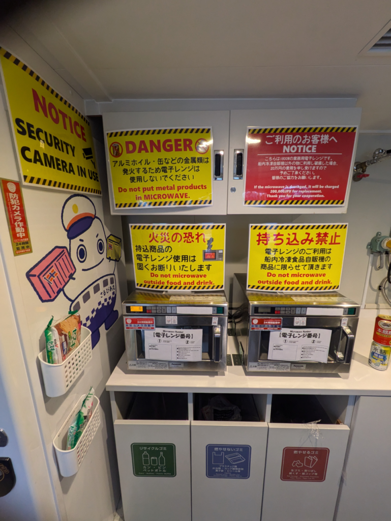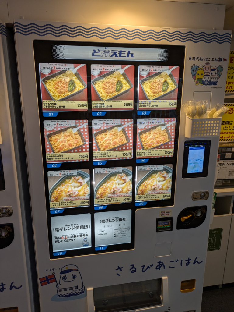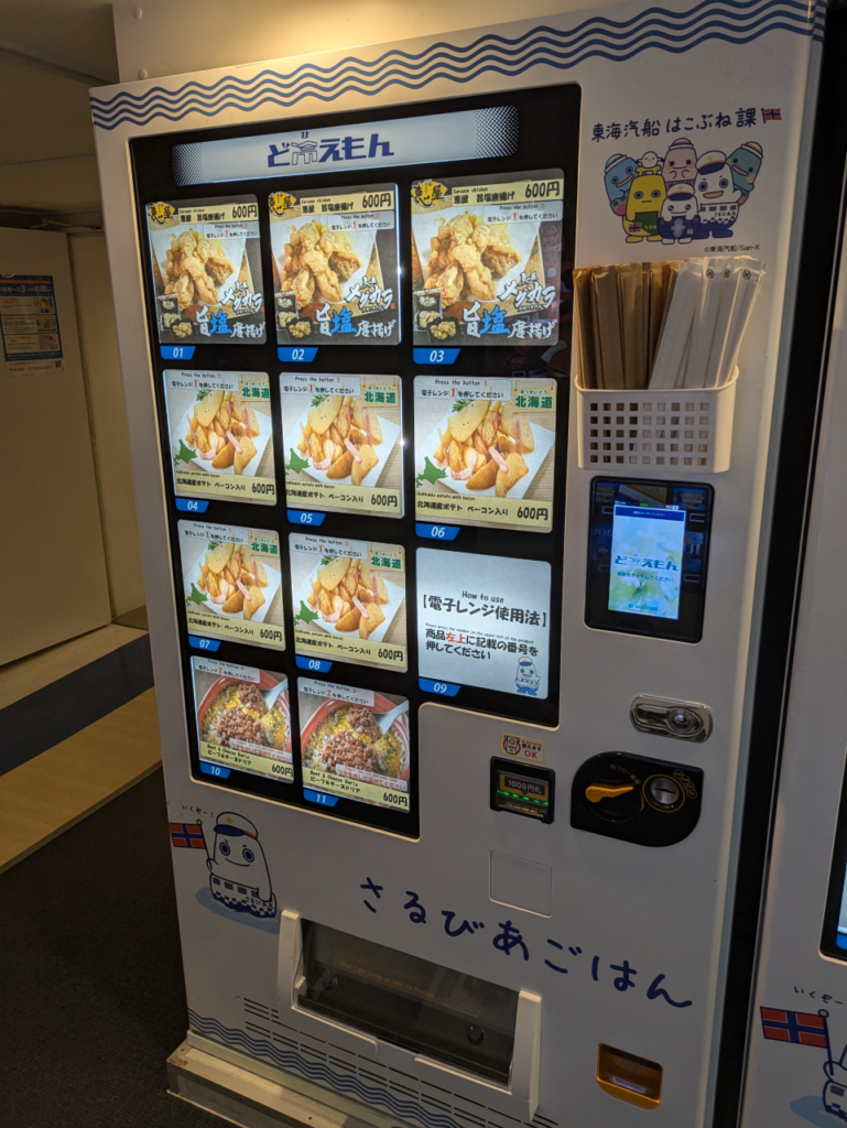 代わりに楽しんだのが、冷凍食品の自動販売機。この写真はその自販機と、隣にある電子レンジの様子。冷凍から揚げを購入し、温めてデッキでいただきました。