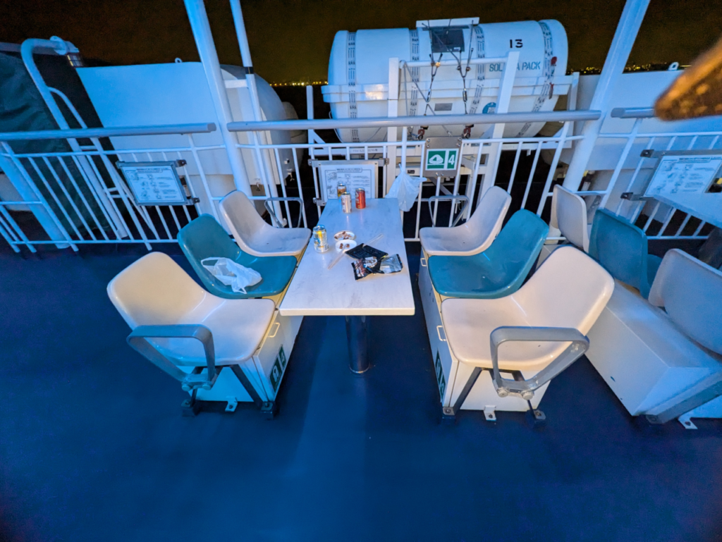 デッキにはテーブル席があり、夜風に吹かれながらのんびり過ごせるスペースが広がっています。この写真は、デッキのテーブル席でお酒とつまみを広げて乾杯している様子。青い照明が幻想的で、まるで海上のラウンジのような雰囲気です。