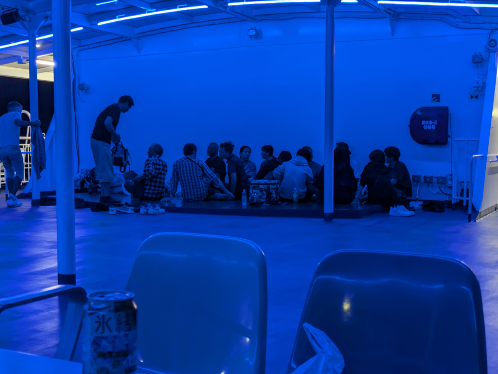 この写真は、デッキのマットスペースに座り込む人たちの様子。夜風に吹かれながら、静かに過ごす時間は、まさに“移動を楽しむ”という感覚そのものでした。