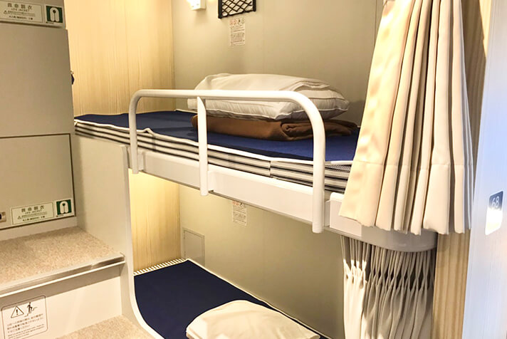 今回は「特2等室」を予約。カーテンで仕切られた2段ベッドのようなシンプルな部屋ですが、寝るだけなら十分。荷物を置いたら、すぐにデッキへと向かいます。